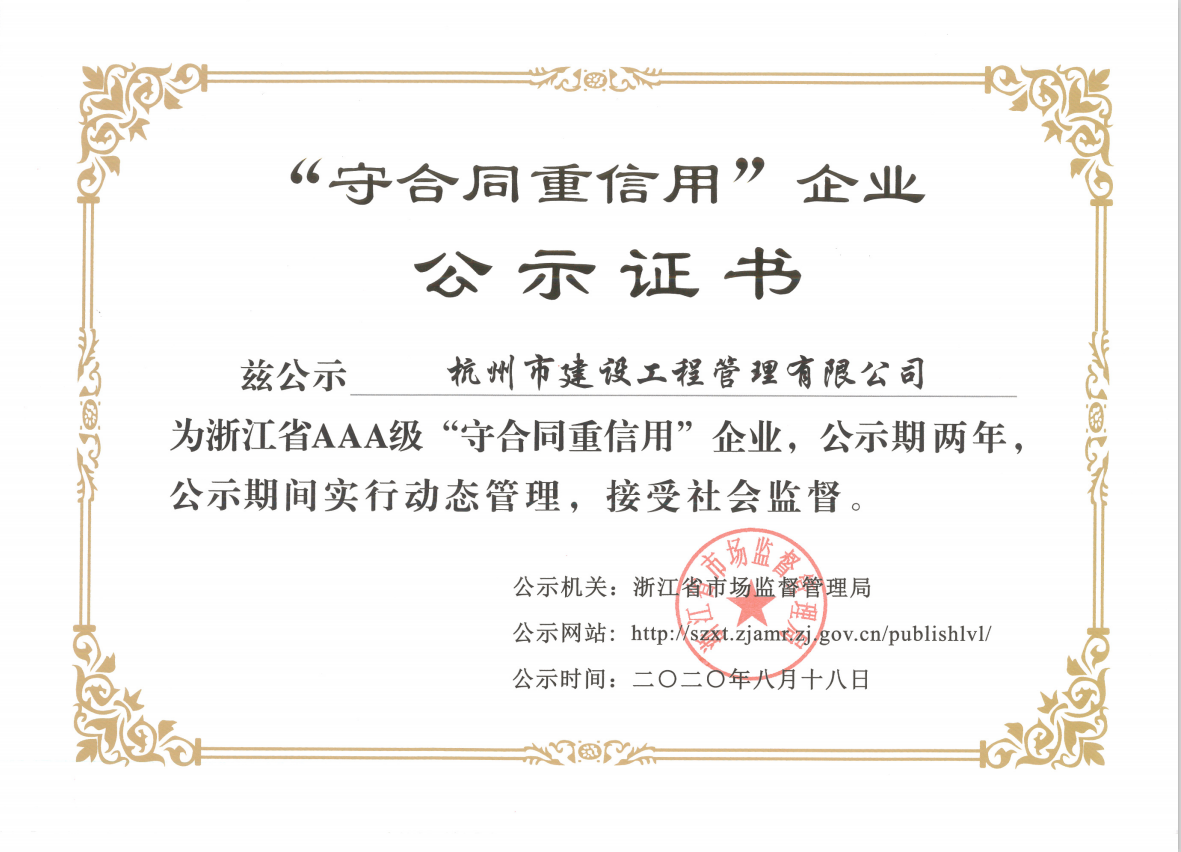 米兰网页版登录入口_米兰MiLan(中国)建设工程管理有限公司荣获2020年浙江省AAA级“守合同重信用”公示证书,不仅证实了杭建“不信不立,不诚不行”一诺千金的企业行为,而且证明了杭建人在砥砺前行的道路上工作井然有序与有条不紊,我们将坚持以严谨的工作态度、实事求是、科学公正的立场,致力于招标代理和造价咨询事业。公司全体员工衷心感谢广大新老客户对公司发展的支持和帮助!